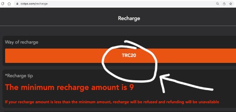 Assuming that the COTPS website currently shows "TRC20" as the "Recharge" method, that means you need Tether (USDT) in your crypto wallet. If you are newly funding a crypto wallet, you'll likely need to send a bank wire from your regular bank account in USD to your crypto wallet, then buy Tether with your USD inside your crypto wallet/exchange. There is likely a fee to do that."TRC20" is the network that is used to send a digital currency called "Tether." Tether is also known as "USDT".TRC20 is not a currency or coin. It is a transfer network for Tether.USDT is a digital currency that is pegged to the U.S. dollar so that the value of it matches very closely the value of dollars. There are a number of digital currencies which are pegged to the dollar like this. They are referred to as "stable coins" generally.When you do your withdrawal from your crypto wallet to fund your COTPS wallet MAKE SURE YOU ARE SENDING THE CORRECT CRYPTO CURRENCY VIA THE CORRECT NETWORK.